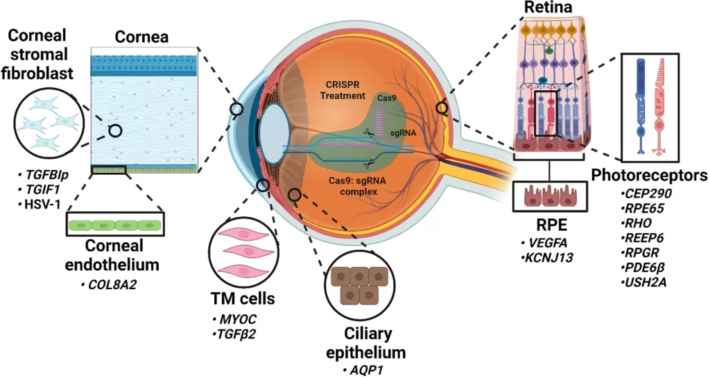 CRISPR-Cas9 offers a promising approach to treating inherited and acquired eye diseases. Researchers target specific faulty genes in retinal cells to restore or preserve vision (Sundaresan et al., 2023). For example, in inherited retinal dystrophies, CRISPR corrects mutations in photoreceptor cells, preventing degeneration and improving retinal function (Chien et al., 2022). Subretinal delivery of CRISPR components allows precise editing without affecting other tissues (Hu et al., 2023).